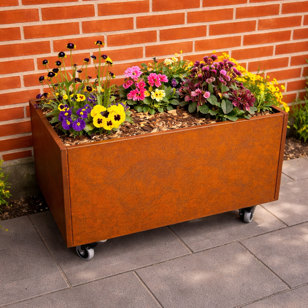 Når du modtager plantekasserne er de stålfarvede, og den smukke cortenfarve vil begynde at træde frem efterhånden som plantekasserne udsættes for vind og vejr. Rækker tålmodigheden ikke til at vente, kan du hjælpe det lidt på vej ved at tørre over med sæbevand og derefter en klud med eddike på.